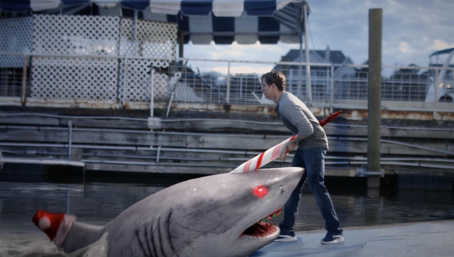 Merely describing the content of Santa Jaws without critique will either persuade or dissuade you from watching this Yuletide masterpiss. This is a movie about a shark with glowing red eyes like Rudolph's nose that wears a Santa hat on its fin. The shark also uses Christmas string lights to lasso victims, and she gains a candy cane horn to impale hapless folks in her path. Jingle bells accompany the shark's every appearance, Christmas things attract it (but not iconic songs that are too expensive to license), and only Christmas things can harm it, including exploding baubles. Writer Jake Kiernan, scripting his first and only movie to date, fills the screenplay with hysterical puns - "See you in Jingle Hell," "Santa Jaws is coming to town," and "Ho, ho, ho, you son of a fish" are among the film's arsenal of gut-busting one-liners.